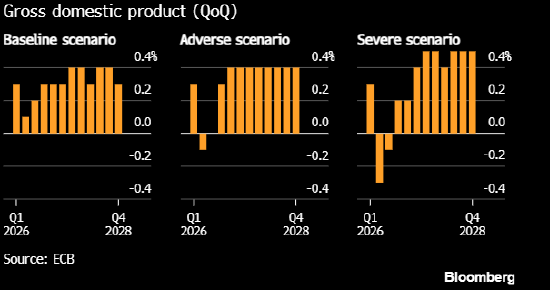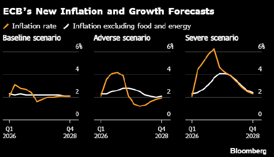 欧洲央行的最新预测显示,基线情境下,今年欧元区CPI预计将上涨2.6%,远超之前的预想。极端情境下,如果油气供应冲击持续,通胀率可能达到6.3%。