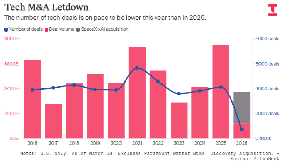 今年一季度截至目前,已宣布或完成的科技并购交易总额达 3750 亿美元。但其中约三分之二的规模都来自一笔大额交易:埃隆・马斯克旗下 SpaceX 以 2500 亿美元收购其人工智能实验室 xAI。